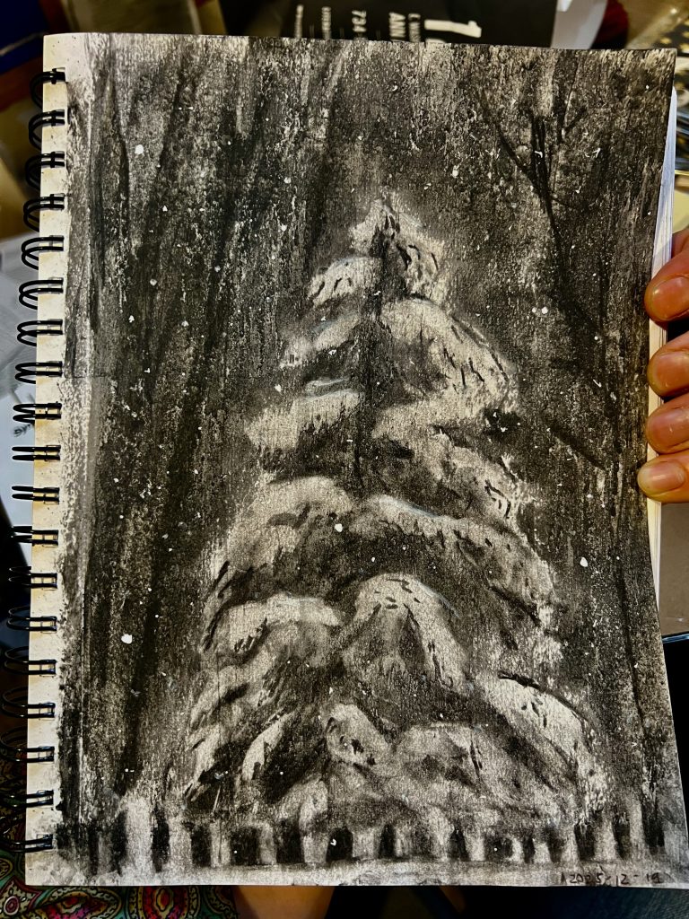 This is the final Sketch of the Week for 2025. It’s a charcoal I did to mail to my nephew, who’s in whatever-comes-after-basic-training for the US Army, down in San Antonio. No snow there, so I’m sending him some of ours.